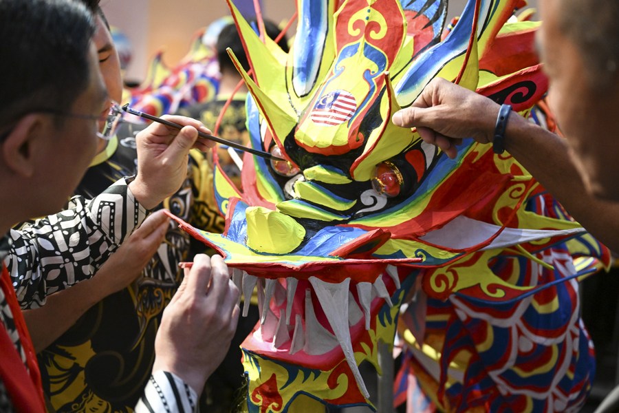 A guest is putting the finishing touches on the auspicious dragon with a calligraphy brush in a shopping mall in Kelang, Selangor State, Malaysia, on Jan. 7, 2024. (Xinhua/Cheng Yiheng)