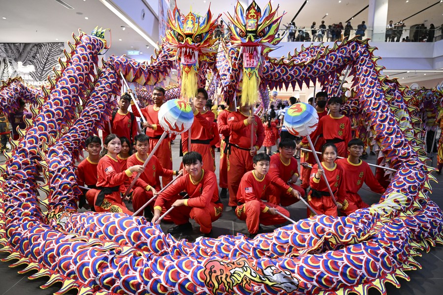 Dragon dancers are taking a group photo in a shopping mall in Kelang, Selangor State, Malaysia, on Jan. 7, 2024. (Xinhua/Cheng Yiheng)
