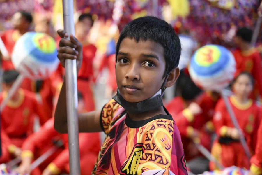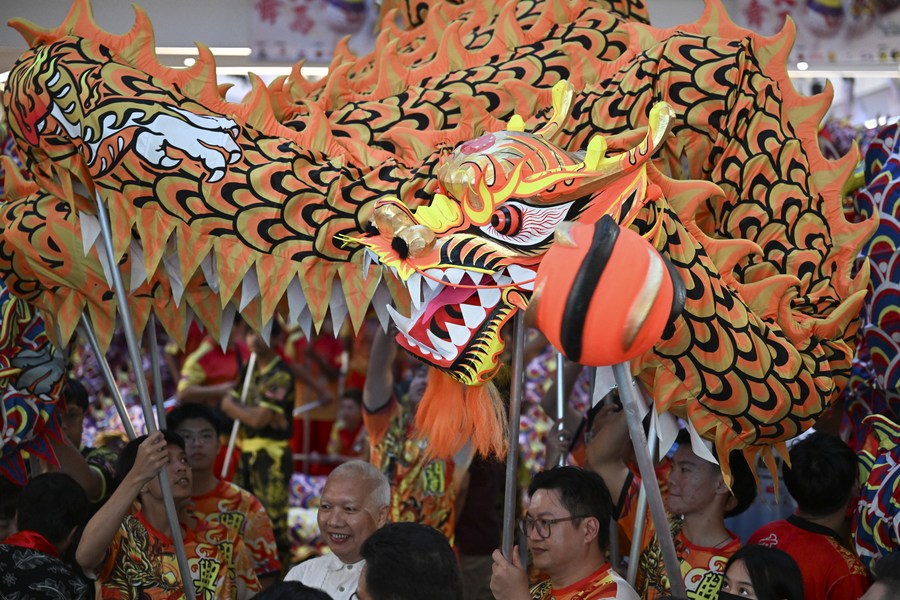 A dragon dance performance is staged in a shopping mall in Kelang, Selangor State, Malaysia, on Jan. 7, 2024. (Xinhua/Cheng Yiheng)