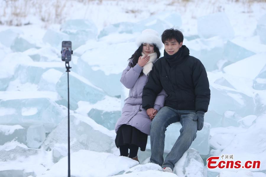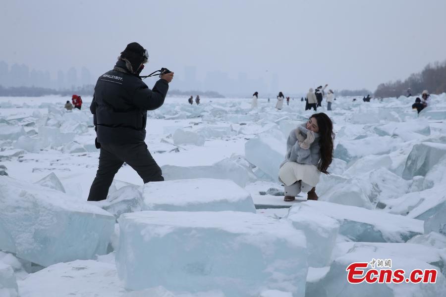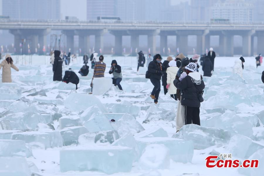 Tourists pose for photos on the frozen Songhuajiang River in Harbin, northeast China's Heilongjiang Province, Jan. 6, 2024. (Photo: China News Service/Yu Kun)