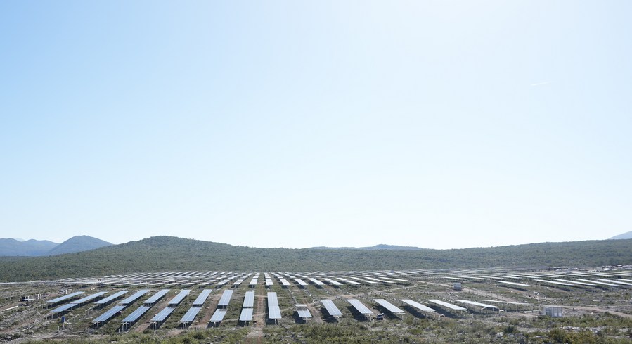 This photo taken on Oct. 12, 2023 shows a photovoltaic power station under construction in Bileca, Bosnia and Herzegovina. The solar panels and parts used in the power station are all imported from China. (Xinhua/Hong Zehua)