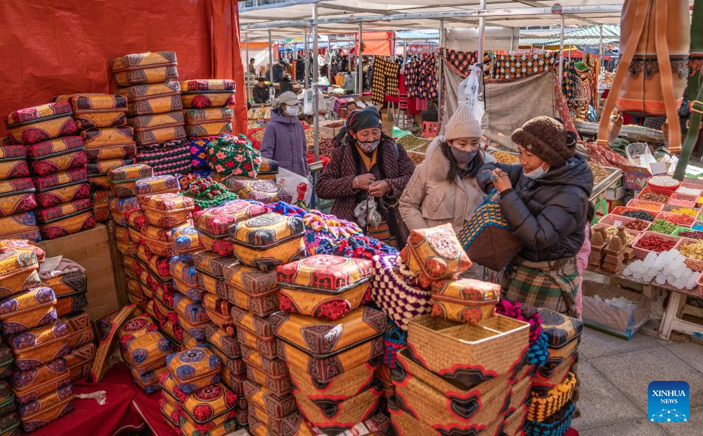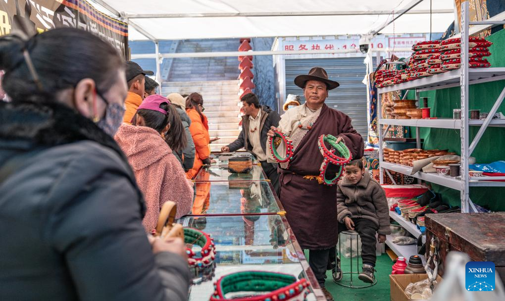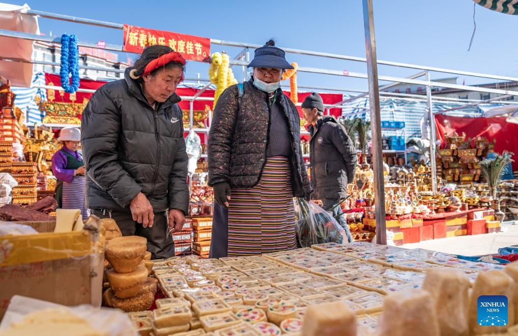 People shop for goods for the farmers' New Year at a market in Xigaze, southwest China's Xizang Autonomous Region, Jan. 9, 2024. (Photo by Tenzin Nyida/Xinhua)