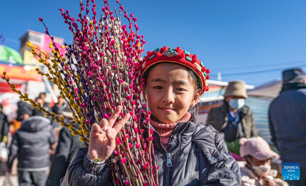 A girl, wearing traditional Tibetan headwear and holding a bunch of artificial flowers purchased for the farmers' New Year, poses for photos at a market in Xigaze, southwest China's Xizang Autonomous Region, Jan. 9, 2024. (Photo by Tenzin Nyida/Xinhua)