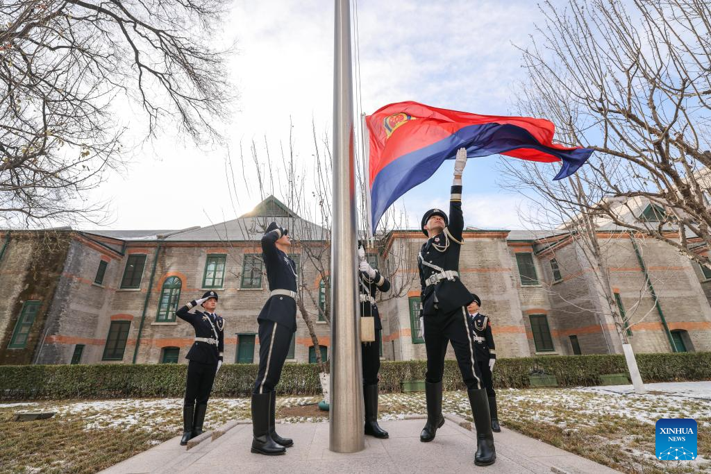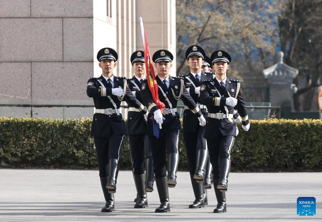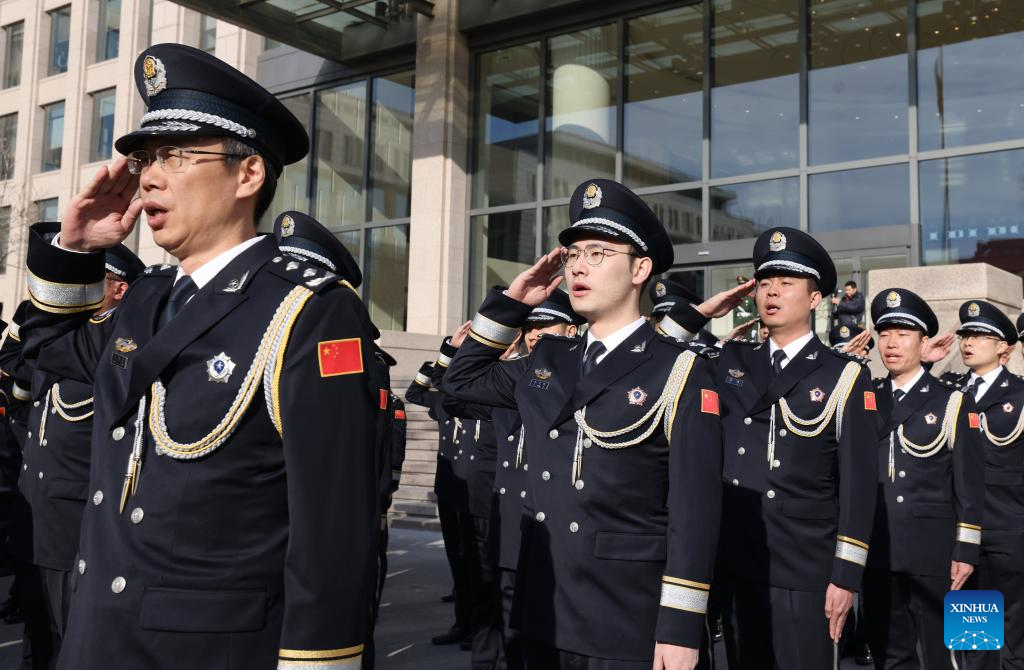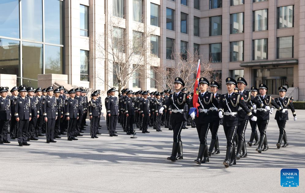 A flag-raising ceremony is held at the Ministry of Public Security in Beijing, capital of China, Jan. 10, 2024. China marked its fourth national police day on Wednesday. (Xinhua/Yin Gang)
