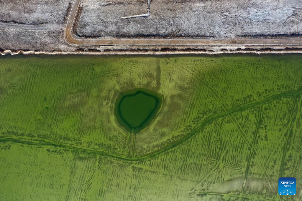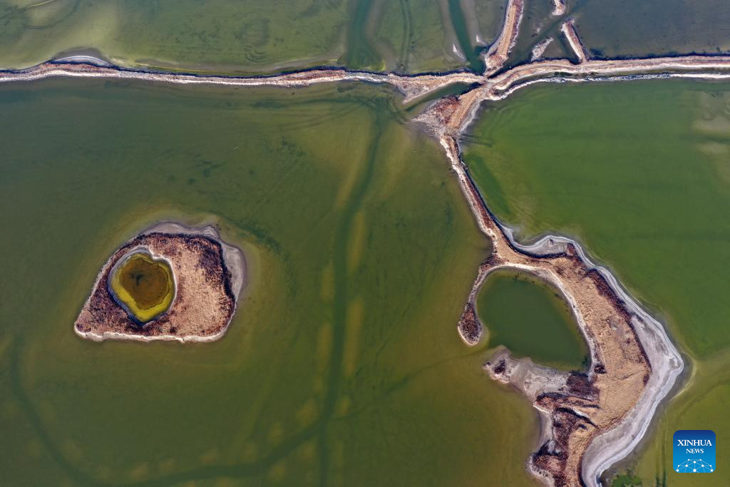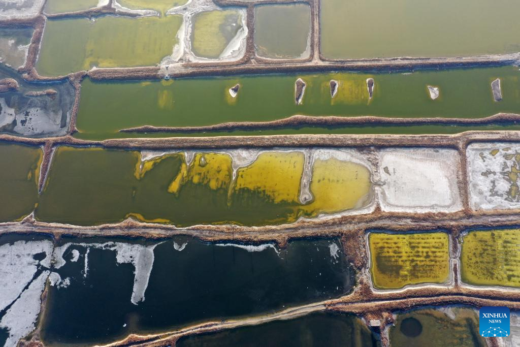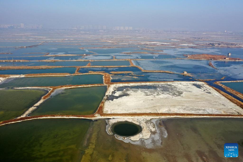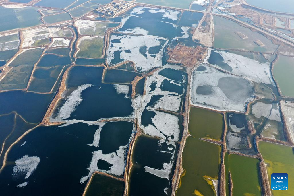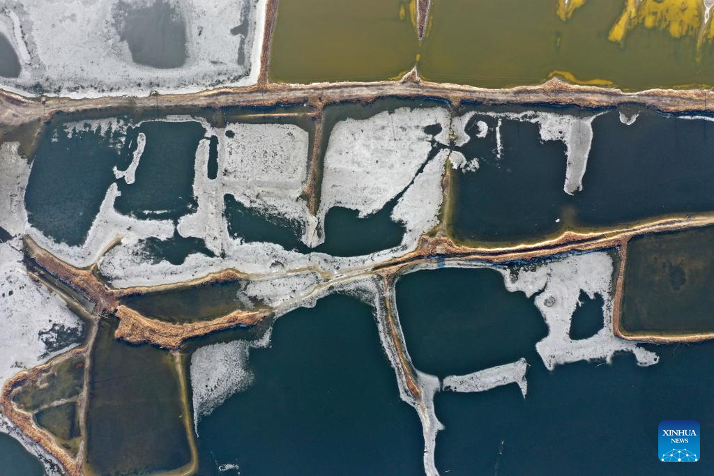 This aerial photo taken on Jan. 10, 2024 shows a winter view of the Salt Lake in Yuncheng City, north China's Shanxi Province. Yuncheng Salt Lake has a mining history of more than 4,600 years, with profound cultural heritage and significant historical value. (Xinhua/Zhan Yan)