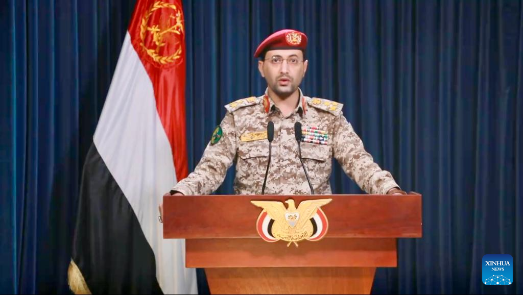 This screenshot captured from a video released by the Houthi group on Jan. 10, 2024 shows Houthi military spokesman Yahya Sarea making a statement. Yemen's Houthi group announced on Wednesday that it has launched "a large batch" of drones and missiles toward a U.S. navy vessel in the Red Sea, which was "assisting" Israel.?(Xinhua)
