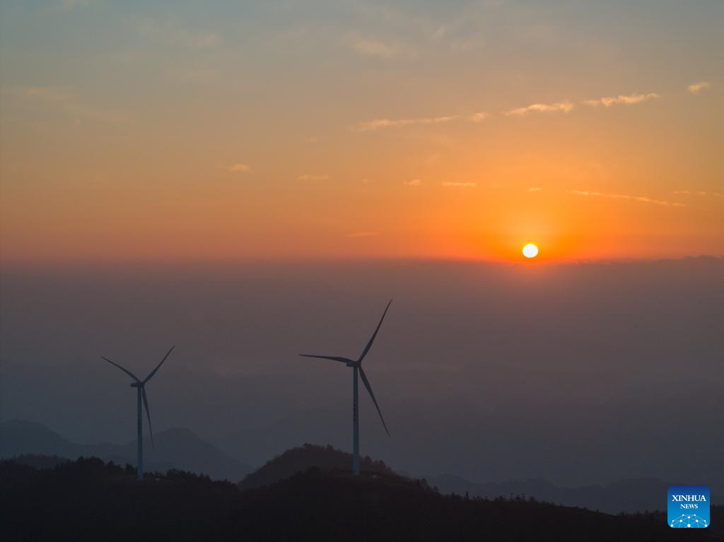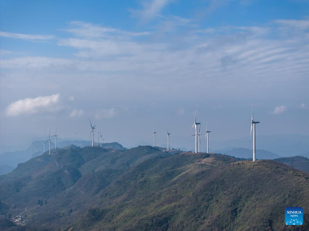 An aerial drone photo taken on Jan. 10, 2024 shows wind turbines in Yuchi Town of Shizhu Tujia Autonomous County, southwest China's Chongqing. The installed capacity of wind power and power generation from wind in Shizhu have reached 372,000 kW and 731 million kWh respectively. (Xinhua/Huang Wei)