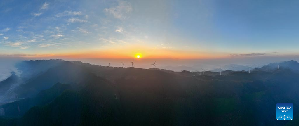 An aerial panoramic drone photo taken on Jan. 10, 2024 shows wind turbines in Yuchi Town of Shizhu Tujia Autonomous County, southwest China's Chongqing. The installed capacity of wind power and power generation from wind in Shizhu have reached 372,000 kW and 731 million kWh respectively. (Xinhua/Huang Wei)