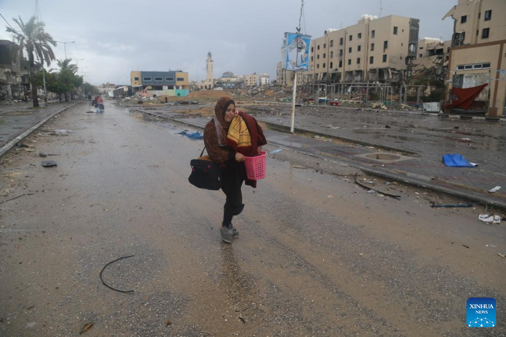A woman walks past damaged buildings in the northern Gaza Strip town of Beit Lahia, on Jan. 11, 2024. The Palestinian death toll from ongoing Israeli attacks on the Gaza Strip has risen to 23,469, the Gaza-based Health Ministry said on Thursday. (Photo by Abdul Rahman Salama/Xinhua)
