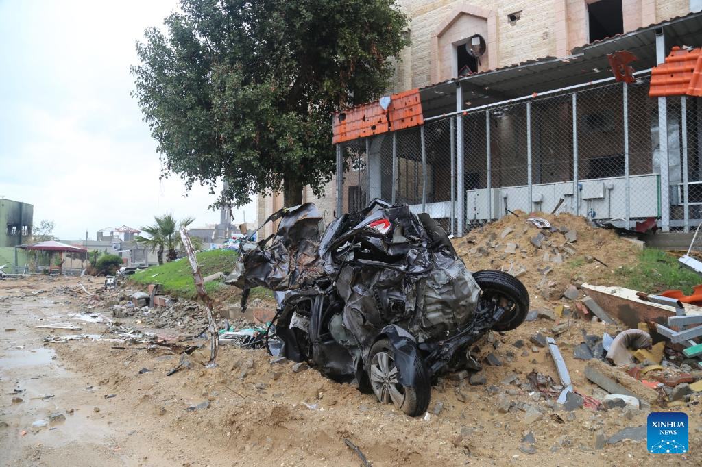 Photo taken on Jan. 11, 2024 shows a damaged car in the northern Gaza Strip town of Beit Lahia. The Palestinian death toll from ongoing Israeli attacks on the Gaza Strip has risen to 23,469, the Gaza-based Health Ministry said on Thursday. (Photo by Abdul Rahman Salama/Xinhua)