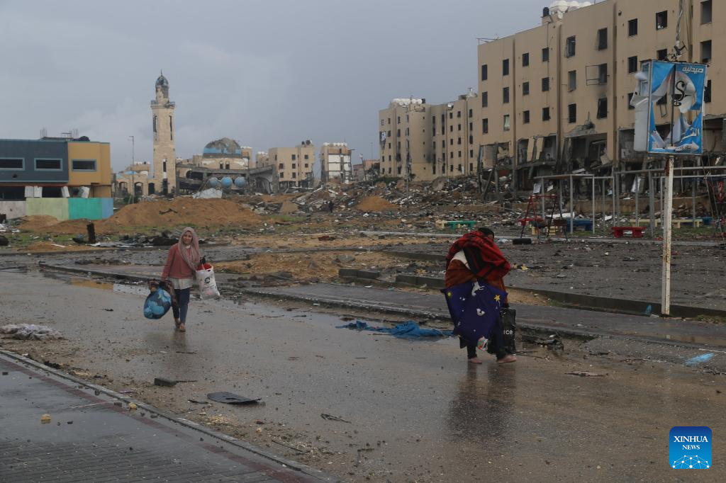 People walk past damaged buildings in the northern Gaza Strip town of Beit Lahia, on Jan. 11, 2024. The Palestinian death toll from ongoing Israeli attacks on the Gaza Strip has risen to 23,469, the Gaza-based Health Ministry said on Thursday. (Photo by Abdul Rahman Salama/Xinhua)