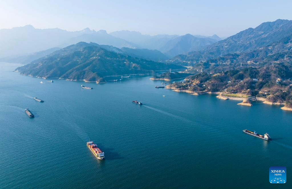 An aerial drone photo taken on Jan. 11, 2024 shows vessels sailing on the Zigui section of the Yangtze River in Yichang, central China's Hubei Province. The cargo throughput via the Three Gorges Dam, the world's largest hydropower project on the upper stream of the Yangtze River, reached a record high of 172.34 million tonnes in 2023, up 7.95 percent year on year, according to the China Three Gorges Corporation. (Photo by Zheng Jiayu/Xinhua)