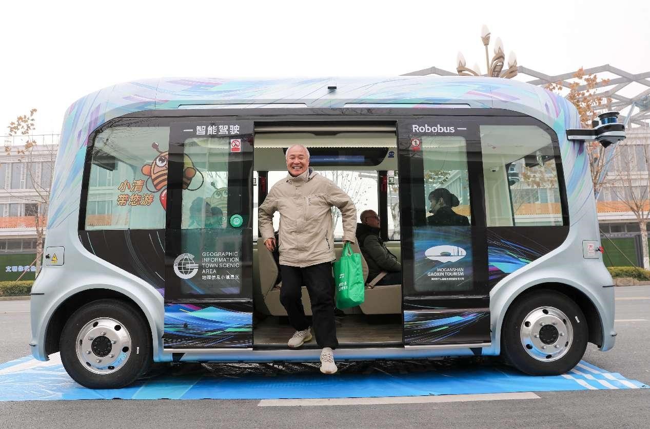 A citizen gets off an autonomous bus in Deqing county, Huzhou, east China's Zhejiang province. (People's Daily Online/Wang Shucheng)
