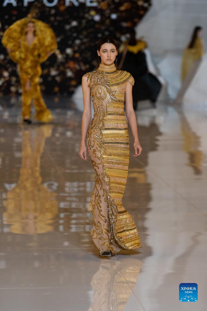 A model presents creations at the Harbin Fashion Week in Harbin, northeast China's Heilongjiang Province, Jan. 11, 2024. The 2024 Harbin Fashion Week kicked off here on Thursday. (Xinhua/Wang Dayu)