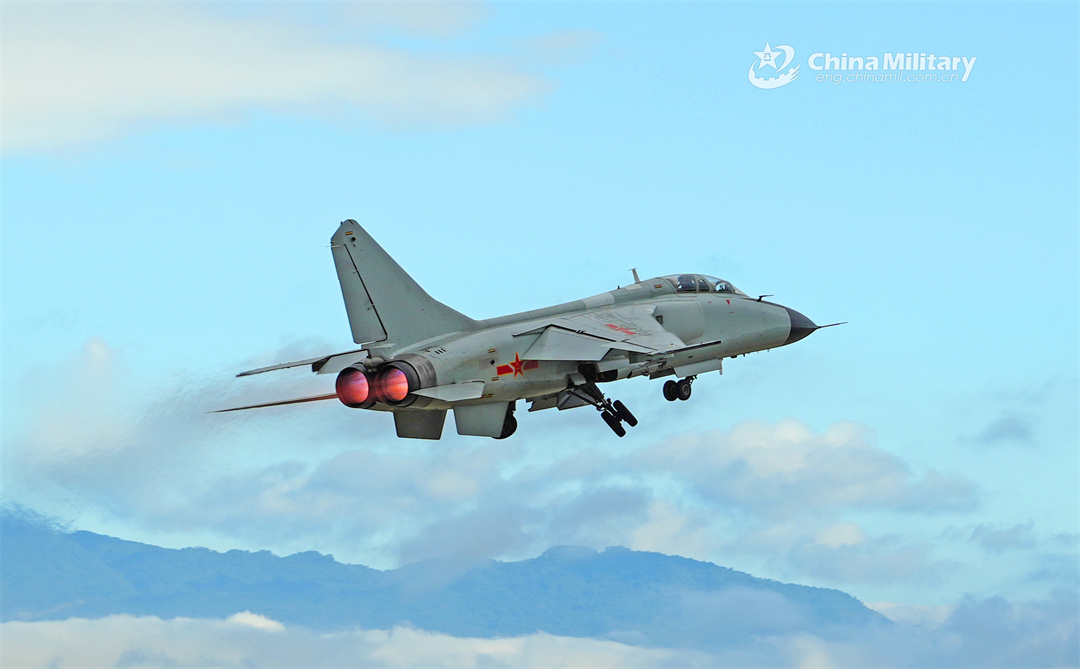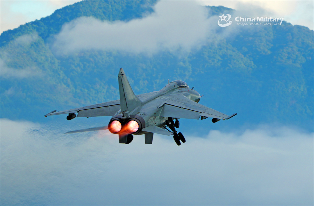 A fighter jet attached to a brigade of the air force under the PLA Southern Theater Command soars into the sky during a live-fire training exercise on December 27, 2023. (eng.chinamil.com.cn/Photo by Zhuo Lingpeng)