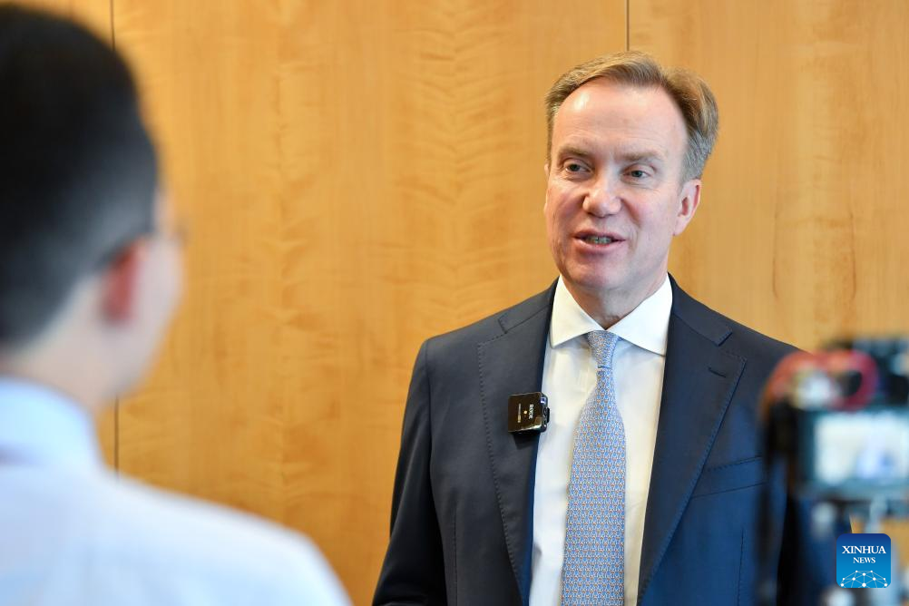 World Economic Forum (WEF) President Borge Brende speaks during an interview with Xinhua at the WEF headquarters in Geneva, Switzerland, Jan. 9, 2024. (Xinhua/Lian Yi)