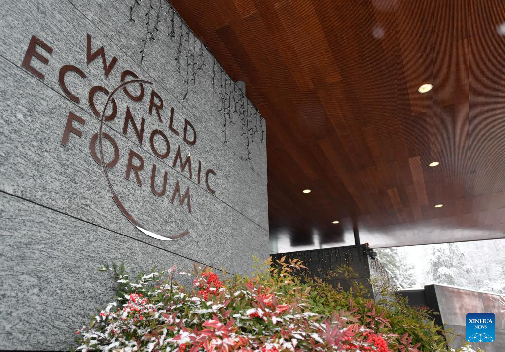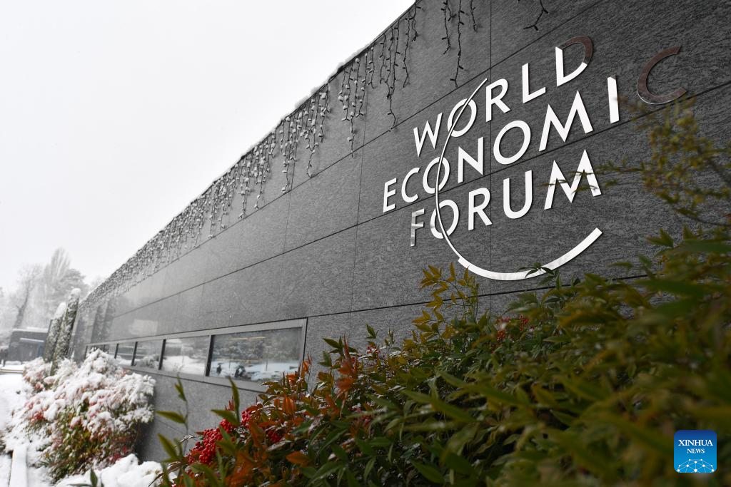 A logo of the World Economic Forum (WEF) is pictured at the WEF headquarters in Geneva, Switzerland, Jan. 9, 2024. (Xinhua/Lian Yi)