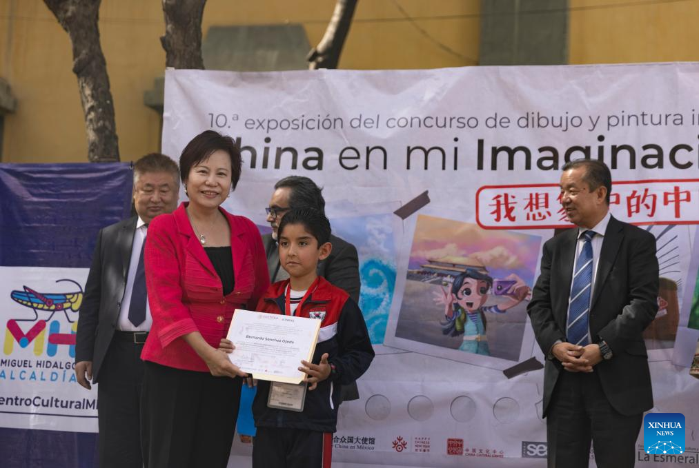 Zhuang Lixiao (L, front), cultural advisor to Chinese Embassy in Mexico, presents a certificate to a contestant in Mexico City, Mexico, Jan. 10, 2024. The tenth "China in my imagination" children's painting contest held its awarding ceremony and the opening ceremony of an exhibition of the entries on Wednesday. (Xinhua/Li Mengxin)