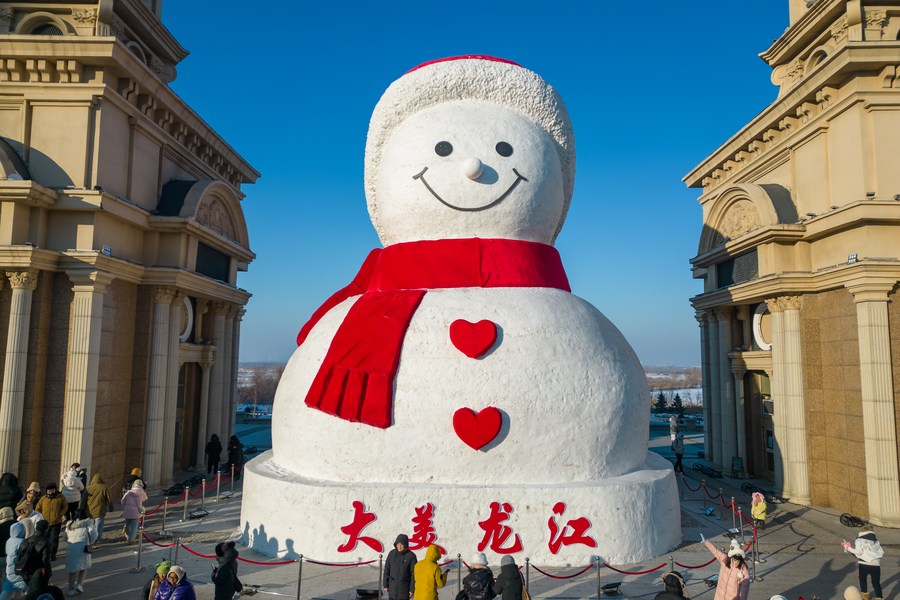 A drone photo shows tourists having fun in front of a giant snowman near the Songhua River in Harbin, the capital city of China's northernmost province of Heilongjiang, on Jan. 9, 2024. (Xinhua/Zhang Tao)