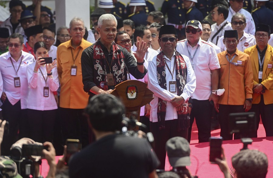 Indonesian presidential candidate Ganjar Pranowo (L, front) delivers a press statement at the elections commission building in Jakarta, Indonesia, Oct. 19, 2023. (Xinhua/Zulkarnain)