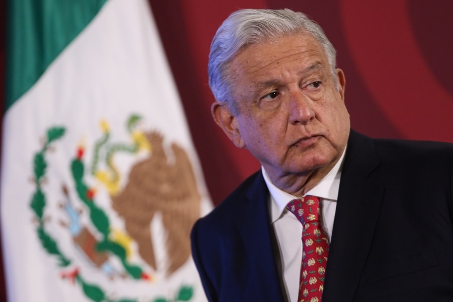 Mexican President Andres Manuel Lopez Obrador reacts during his morning press conference at the National Palace in Mexico City, capital of Mexico, June 6, 2022. (Photo by Francisco Canedo/Xinhua)