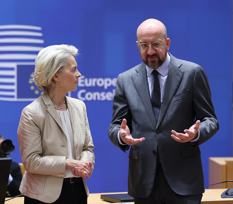 President of the European Commission Ursula von der Leyen (L) talks with European Council President Charles Michel as they attend the EU summit in Brussels, Belgium, on Oct. 27, 2023. (Xinhua/Zhao Dingzhe)