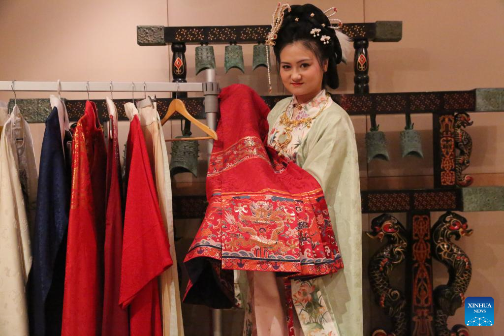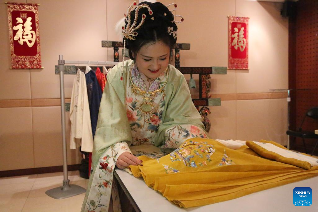 Yu Cheng, who is responsible for managing the Hanfu costume society, shows a set of Hanfu costume at the China Cultural Center in Valletta, Malta, on Jan. 12, 2024. Enthusiasts of Chinese culture in Malta can now immerse themselves in the secrets of Hanfu costumes, a style of clothing traditionally worn by the Han people, thanks to a new cultural platform dabbed "Hanfu costume society" that was launched at the China Cultural Center in Malta on Friday. (Xinhua/Chen Wenxian)