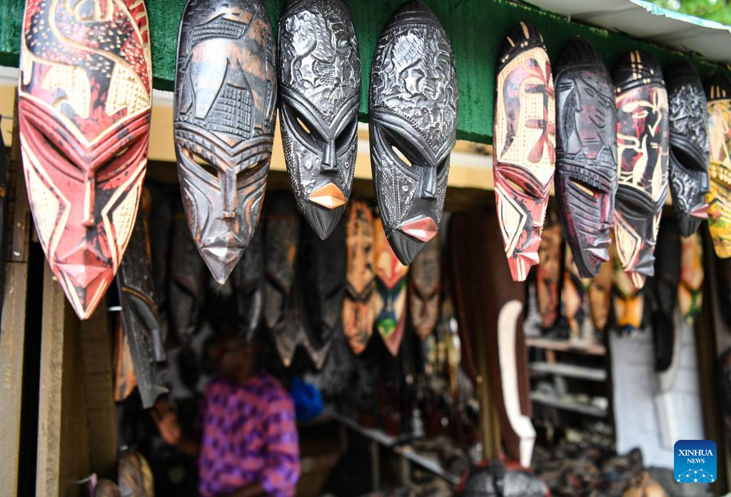 This photo taken on Jan. 12, 2024 shows a shop at a handicraft market in Abidjan, Cote d'Ivoire. (Xinhua/Han Xu)