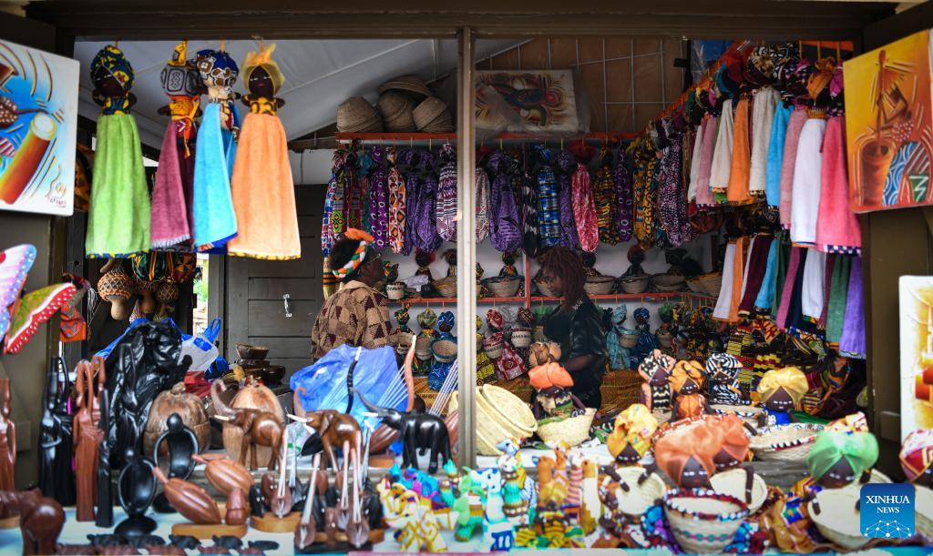 This photo taken on Jan. 12, 2024 shows a shop at a handicraft market in Abidjan, Cote d'Ivoire. (Xinhua/Han Xu)