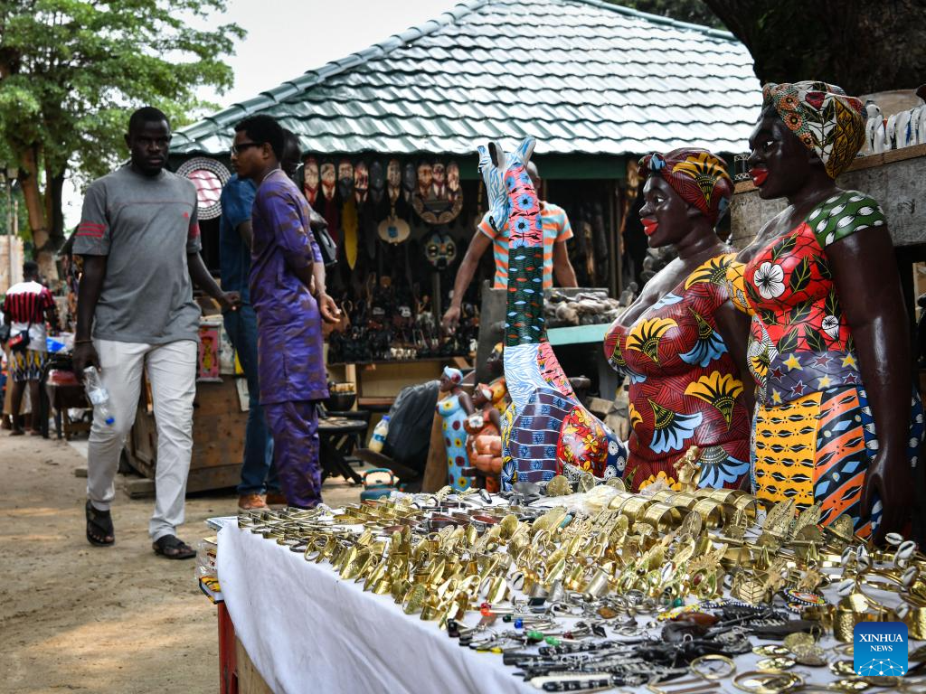 This photo taken on Jan. 12, 2024 shows a handicraft market in Abidjan, Cote d'Ivoire. (Xinhua/Han Xu)
