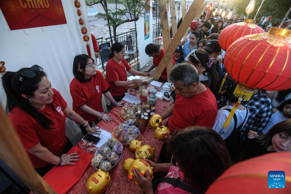 People select products during an event to greet the upcoming Spring Festival in Santiago, Chile, Jan. 13, 2024. (Photo by Jorge Villegas/Xinhua)