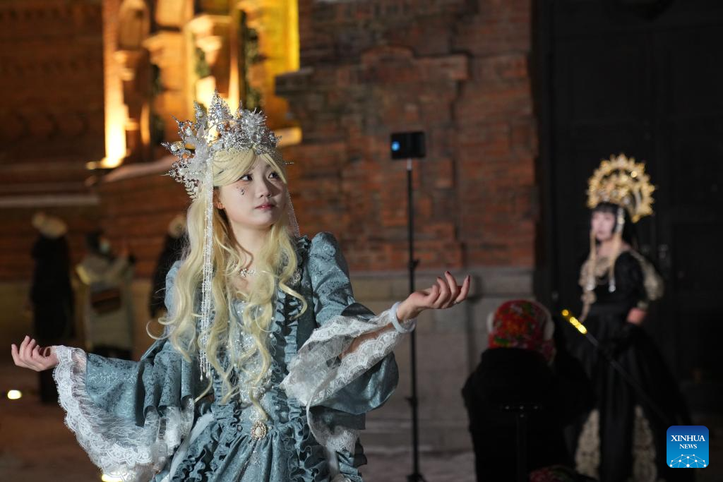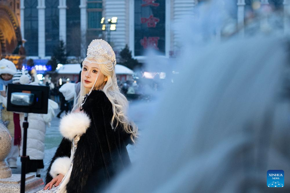 A tourist dressed up in costumes poses for photos at a square in Harbin, northeast China's Heilongjiang Province, Jan. 12, 2024. The square, where the landmark St. Sophia Cathedral, a former Russian Orthodox church and a perfect example of Neo-Byzantine architectures, is located, has become a hot spot for tourists during the city's tourism boom this winter. (Xinhua/Wang Jianwei)