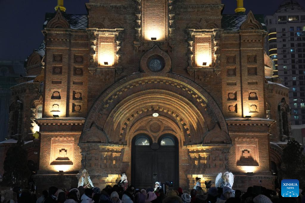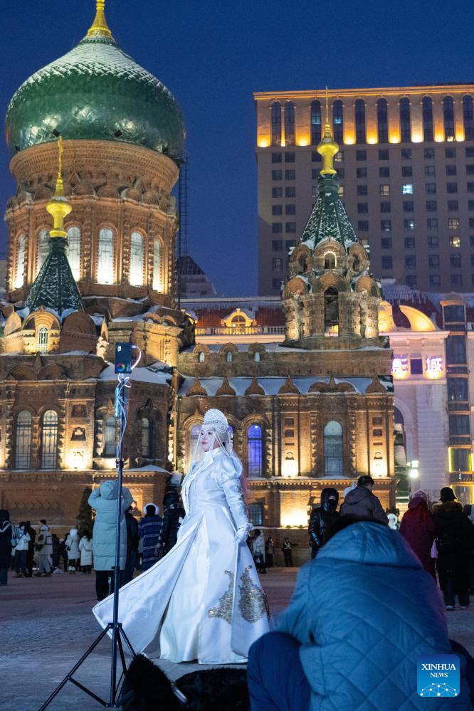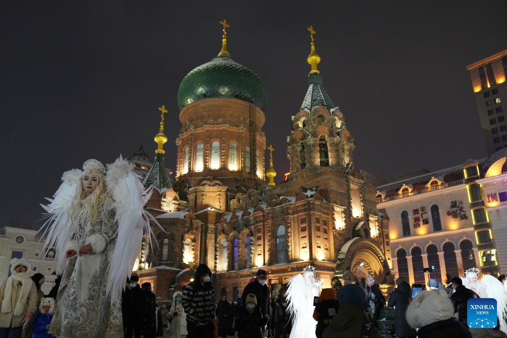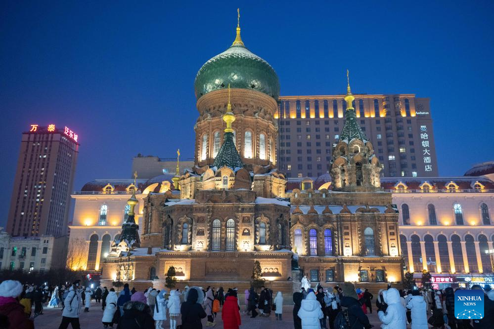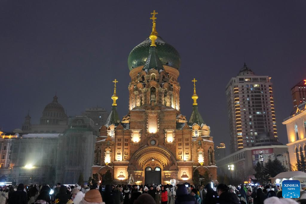 Tourists have fun at a square in Harbin, northeast China's Heilongjiang Province, Jan. 12, 2024. The square, where the landmark St. Sophia Cathedral, a former Russian Orthodox church and a perfect example of Neo-Byzantine architectures, is located, has become a hot spot for tourists during the city's tourism boom this winter. (Xinhua/Xie Jianfei)