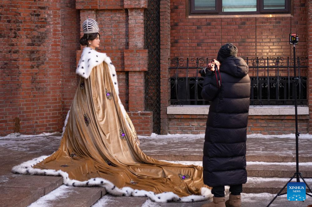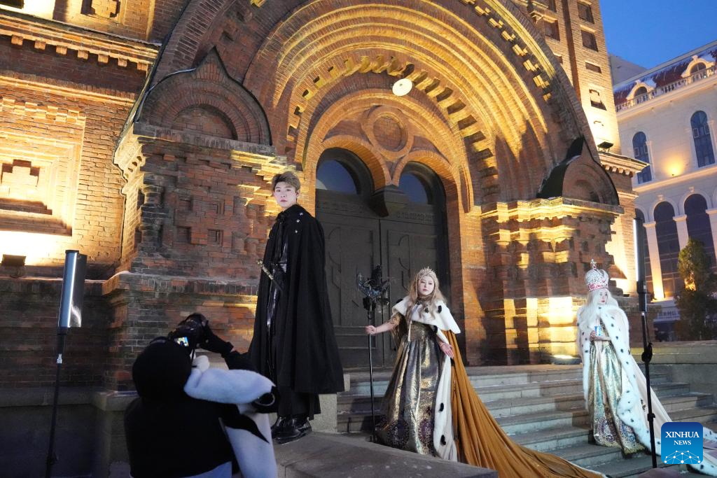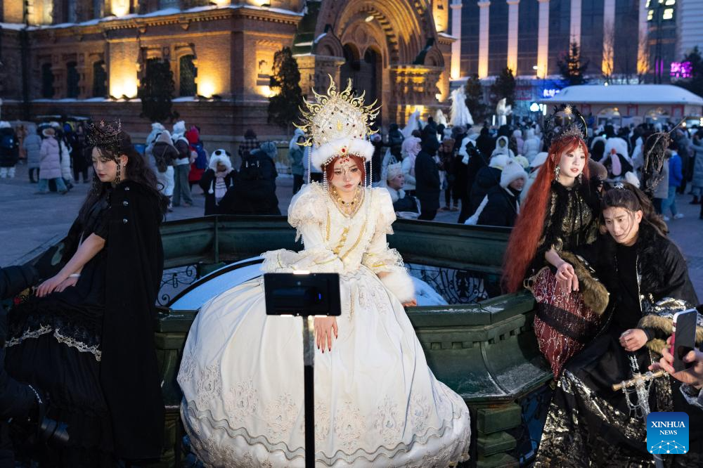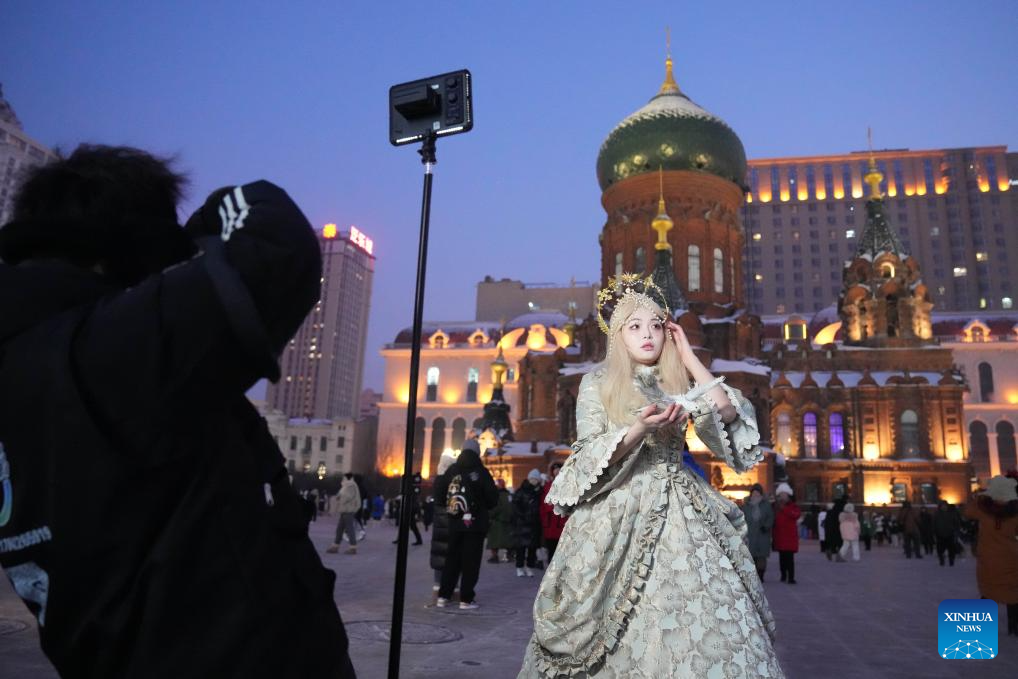 Tourists dressed up in costumes pose for photos at a square in Harbin, northeast China's Heilongjiang Province, Jan. 11, 2024. The square, where the landmark St. Sophia Cathedral, a former Russian Orthodox church and a perfect example of Neo-Byzantine architectures, is located, has become a hot spot for tourists during the city's tourism boom this winter. (Xinhua/Wang Jianwei)