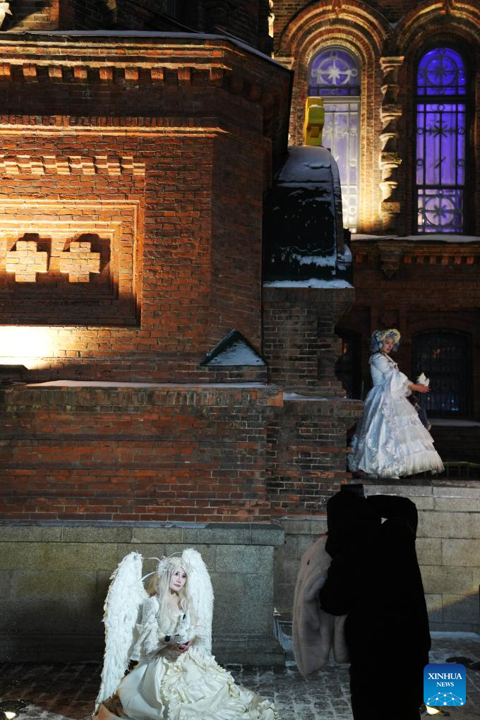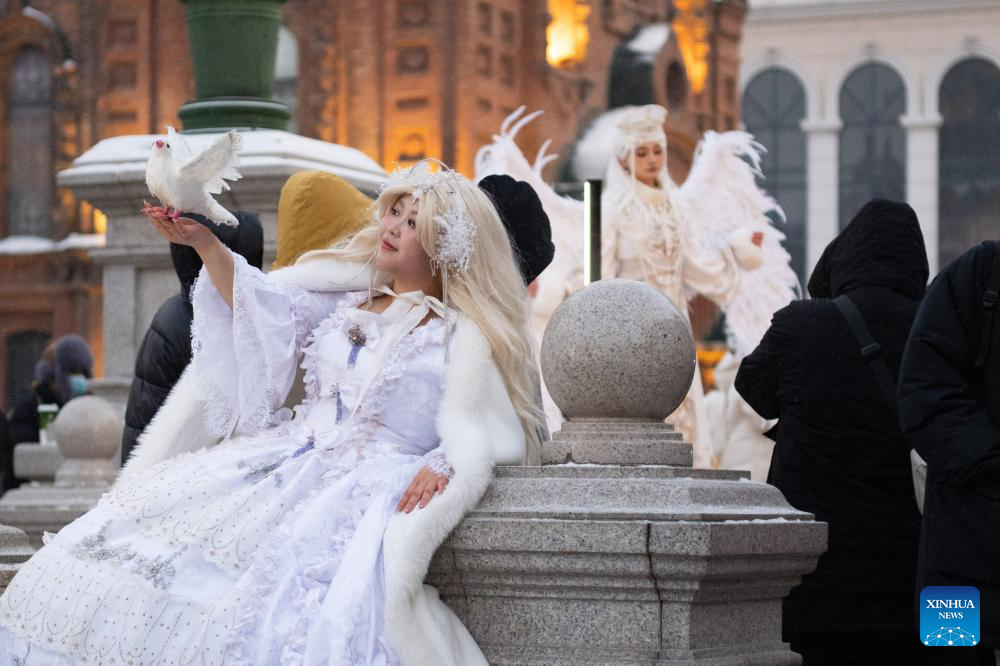Tourists dressed up in costumes pose for photos at a square in Harbin, northeast China's Heilongjiang Province, Jan. 12, 2024. The square, where the landmark St. Sophia Cathedral, a former Russian Orthodox church and a perfect example of Neo-Byzantine architectures, is located, has become a hot spot for tourists during the city's tourism boom this winter. (Xinhua/Wang Jianwei)
