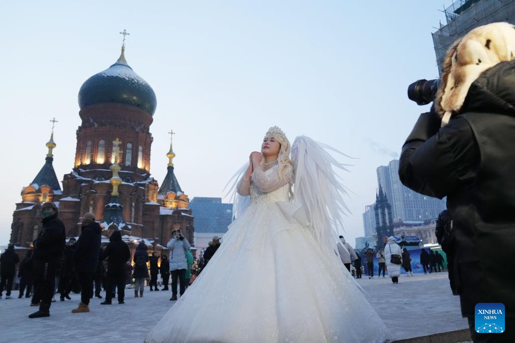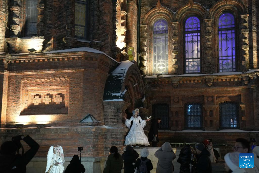 Tourists have fun at a square in Harbin, northeast China's Heilongjiang Province, Jan. 11, 2024. The square, where the landmark St. Sophia Cathedral, a former Russian Orthodox church and a perfect example of Neo-Byzantine architectures, is located, has become a hot spot for tourists during the city's tourism boom this winter. (Xinhua/Wang Jianwei)