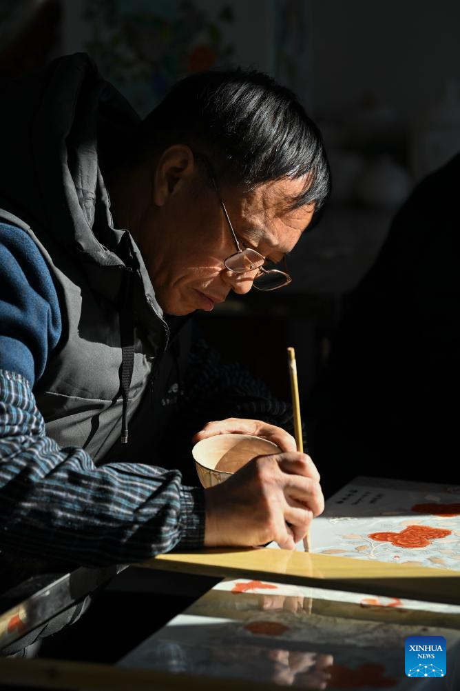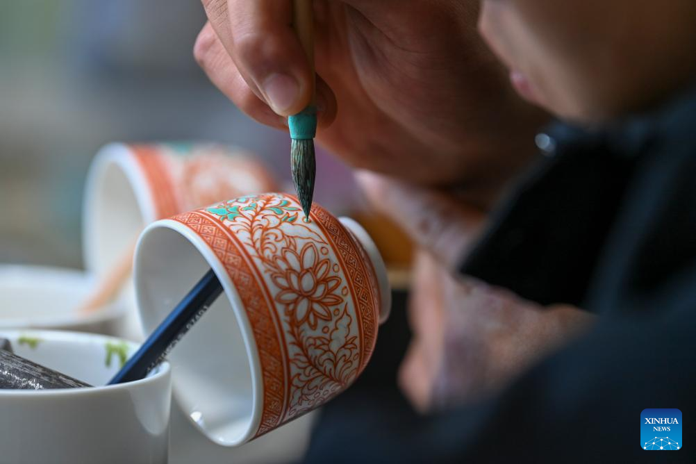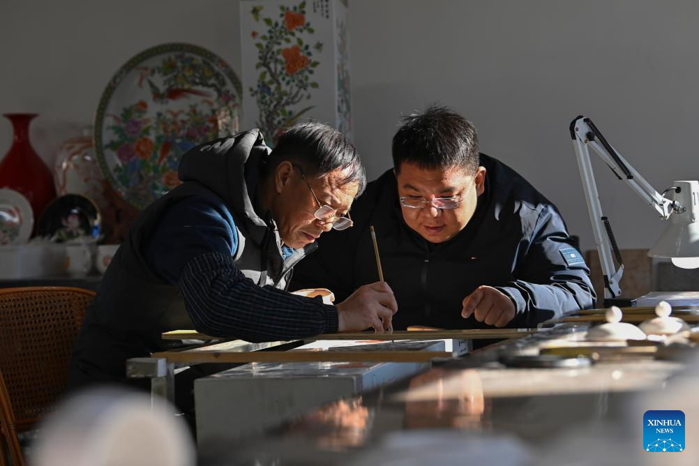 A craftsman paints on a porcelain at a production base of Honglyucai (Red and Green Color) Porcelain in Honglyucai Village, Changzhi City of north China's Shanxi Province, Jan. 4, 2024.(Xinhua/Yang Chenguang)