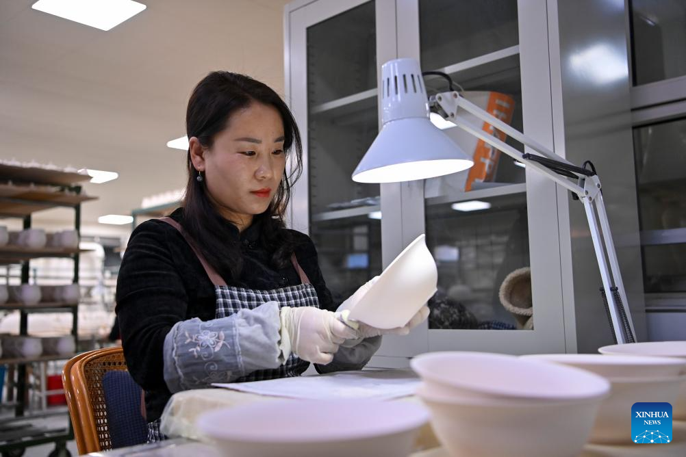 A craftswoman checks a ceramic body at a production base of Honglyucai (Red and Green Color) Porcelain in Honglyucai Village, Changzhi City of north China's Shanxi Province, Jan. 3, 2024. (Xinhua/Yang Chenguang)