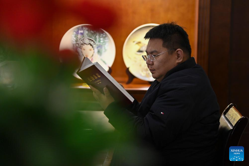 Li Yamin checks data at a Honglyucai (Red and Green Color) Porcelain museum in Honglyucai Village, Changzhi City of north China's Shanxi Province, Jan. 4, 2024. (Xinhua/Yang Chenguang)
