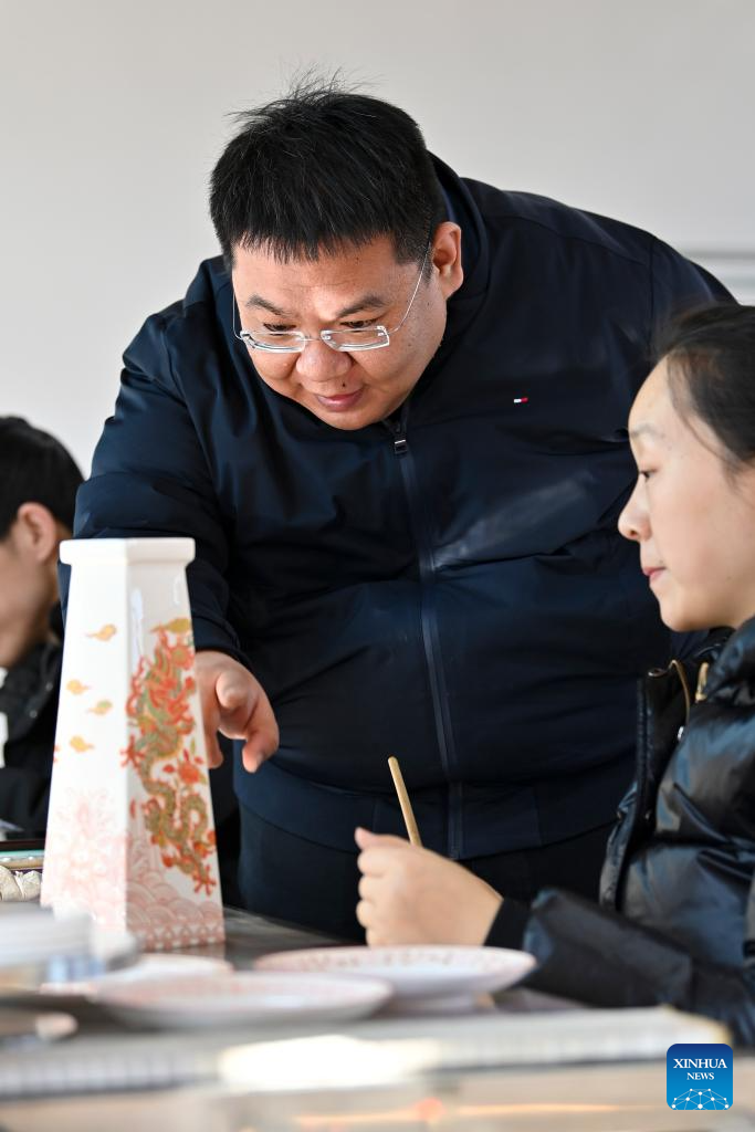Li Yamin checks the color of porcelain at a production base of Honglyucai (Red and Green Color) Porcelain in Honglyucai Village, Changzhi City of north China's Shanxi Province, Jan. 4, 2024. (Xinhua/Yang Chenguang)