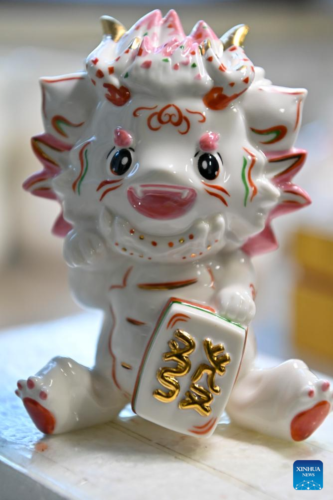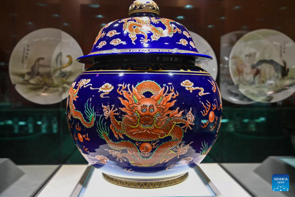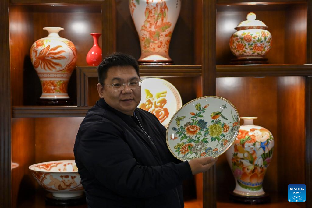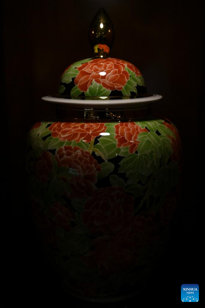 A porcelain artwork is displayed at a production base of Honglyucai (Red and Green Color) Porcelain in Honglyucai Village, Changzhi City of north China's Shanxi Province, Jan. 3, 2024. (Xinhua/Yang Chenguang)