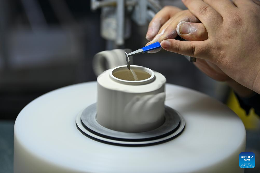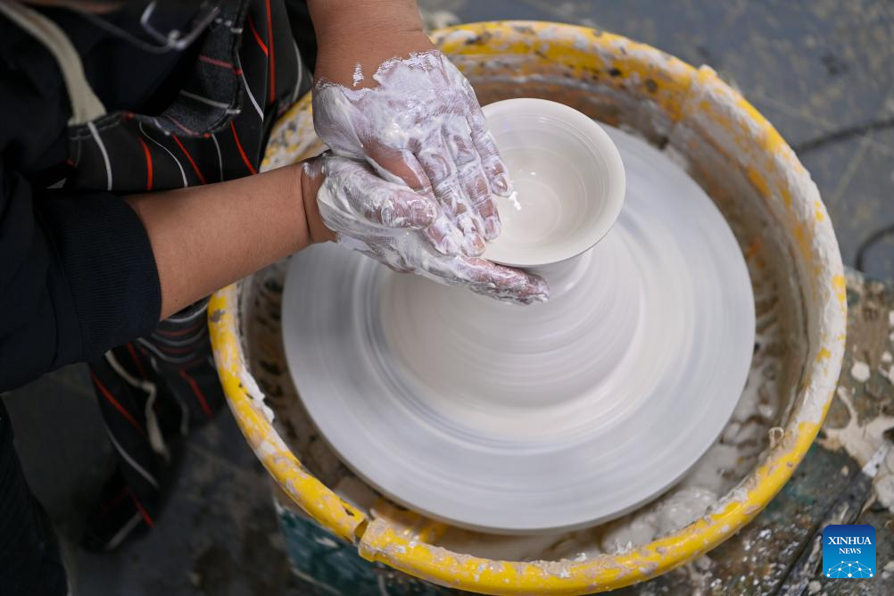 A craftsman makes a ceramic body at a production base of Honglyucai (Red and Green Color) Porcelain in Honglyucai Village, Changzhi City of north China's Shanxi Province, Jan. 3, 2024.(Xinhua/Yang Chenguang)