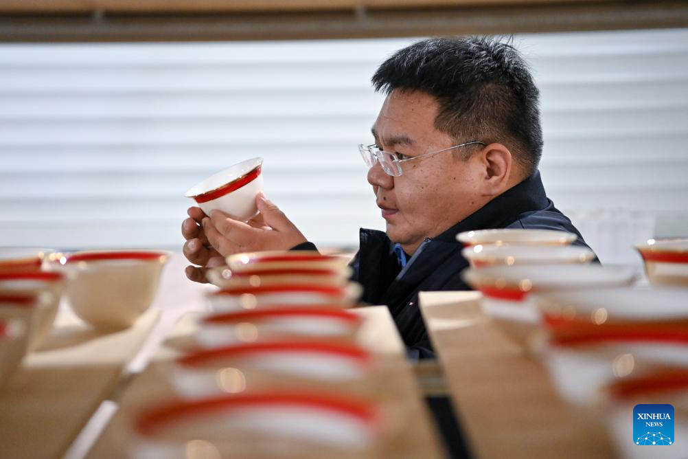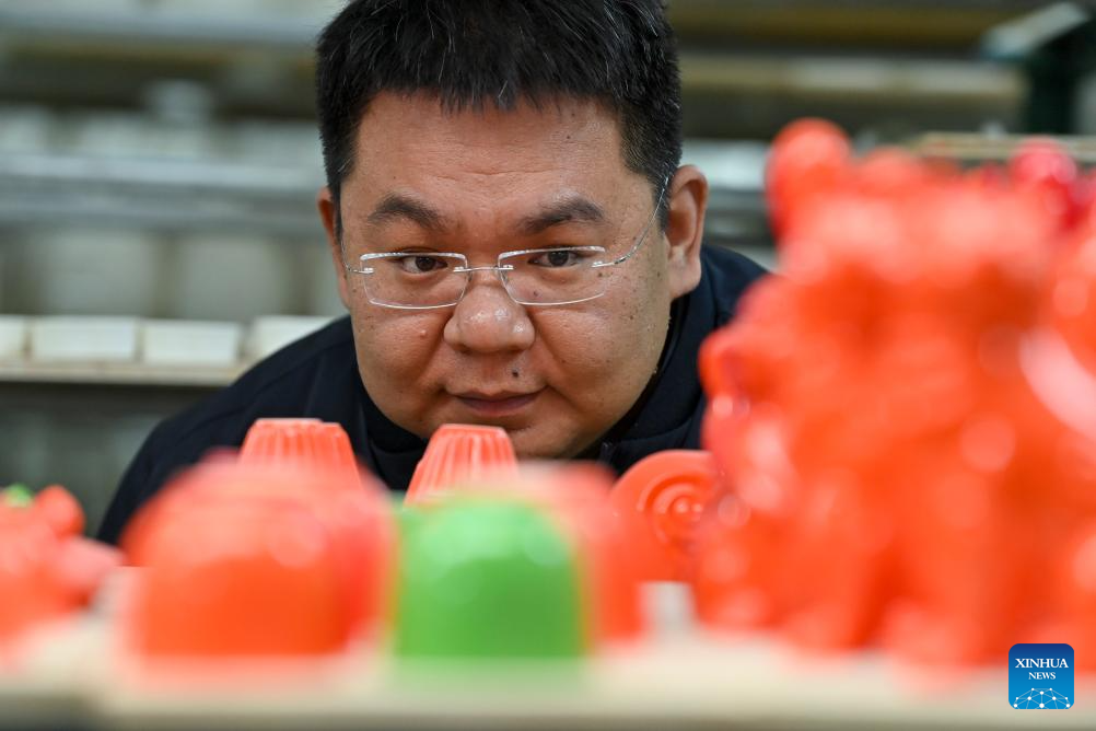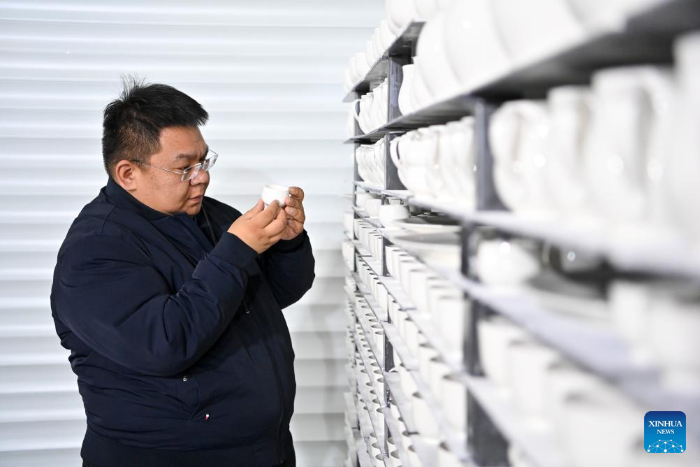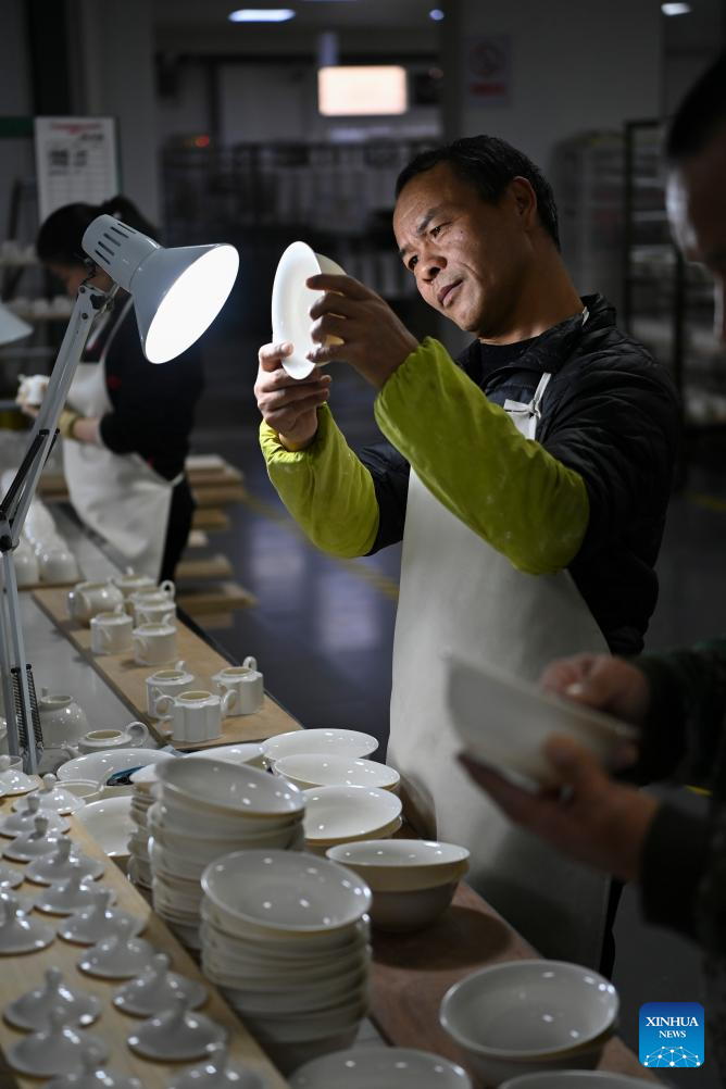 A craftsman checks a piece of porcelain at a production base of Honglyucai (Red and Green Color) Porcelain in Honglyucai Village, Changzhi City of north China's Shanxi Province, Jan. 3, 2024.(Xinhua/Yang Chenguang)