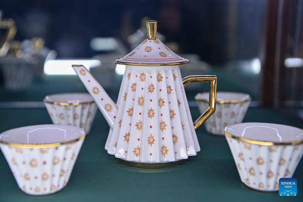 Porcelain tea sets are displayed at a production base of Honglyucai (Red and Green Color) Porcelain in Honglyucai Village, Changzhi City of north China's Shanxi Province, Jan. 3, 2024.(Xinhua/Yang Chenguang)