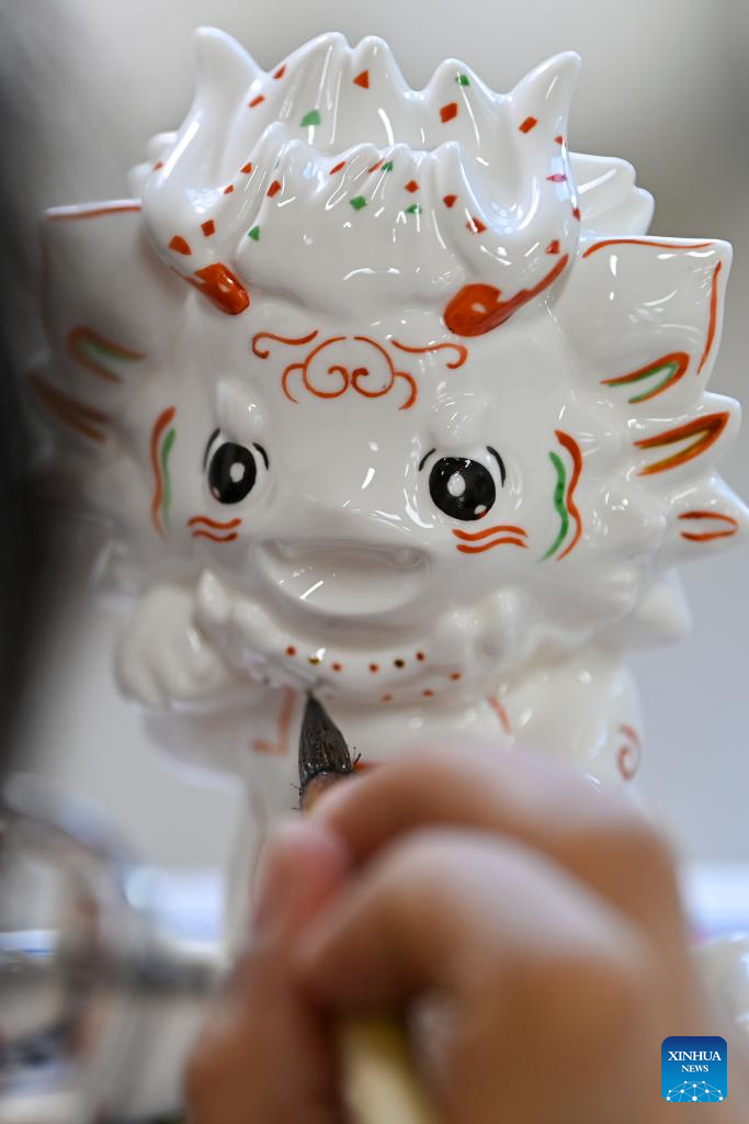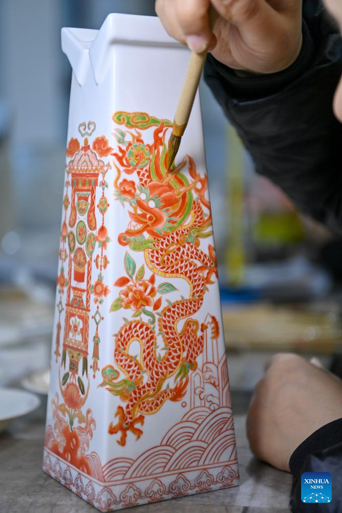 A craftsman paints on a piece of porcelain at a production base of Honglyucai (Red and Green Color) Porcelain in Honglyucai Village, Changzhi City of north China's Shanxi Province, Jan. 4, 2024. (Xinhua/Yang Chenguang)