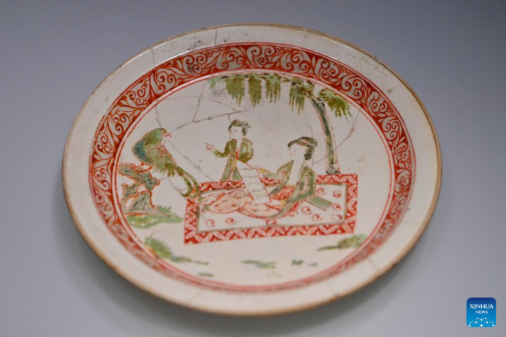 An ancient porcelain dish is displayed at Honglyucai (Red and Green Color) Porcelain museum in Honglyucai Village, Changzhi City of north China's Shanxi Province, Jan. 3, 2024.(Xinhua/Yang Chenguang)