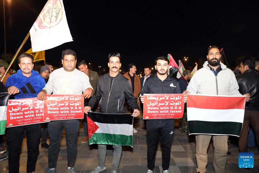 BAGHDAD, Jan. 13 (Xinhua) -- Hundreds of Iraqis held a rally on Saturday in Iraq's capital Baghdad in protest against the U.S.-Britain strikes against some Houthi military sites in Yemen.