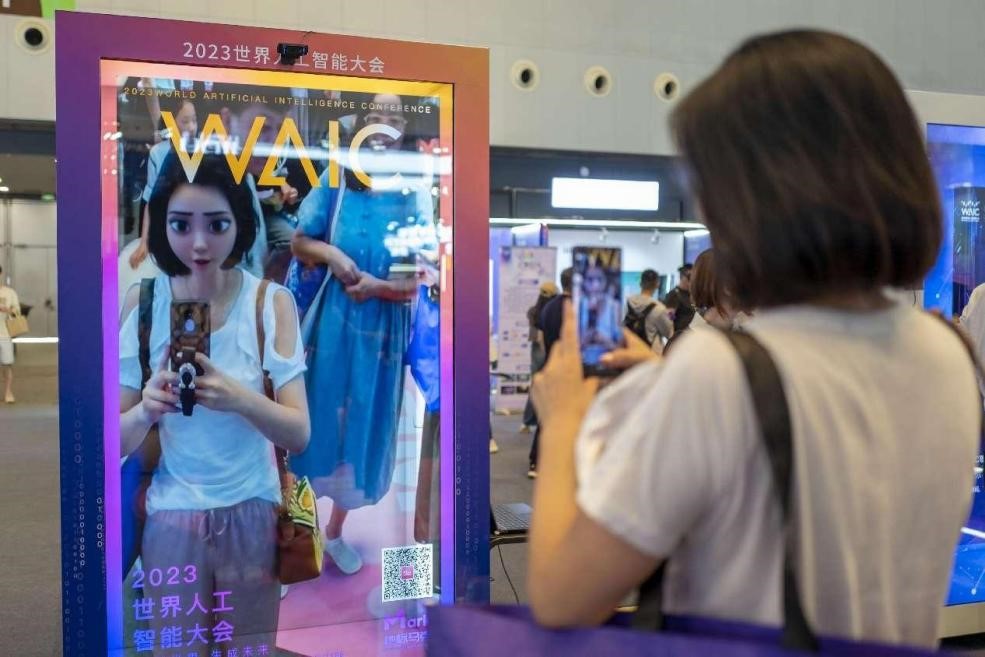 A woman takes pictures of a cartoon image of herself generated by an intelligent application in real time at 2023 World Artificial Intelligence Conference held in east China's Shanghai, July 6, 2023. (People's Daily Online/Wang Chu)