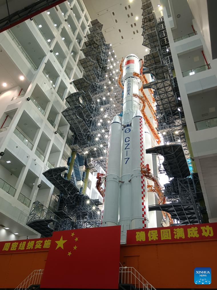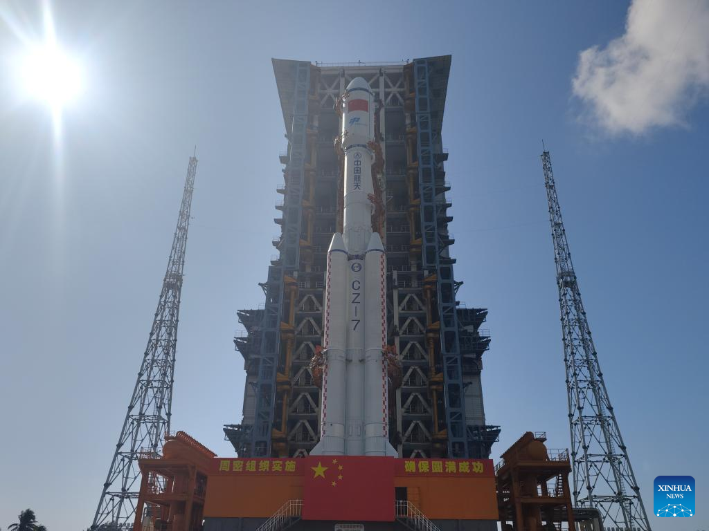 WENCHANG, Hainan, Jan. 15 (Xinhua) -- The combination of the Tianzhou-7 cargo spacecraft and a Long March-7 Y8 carrier rocket was vertically transferred to the launching area on Monday.