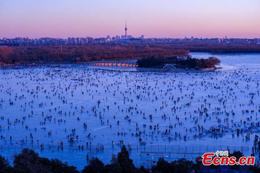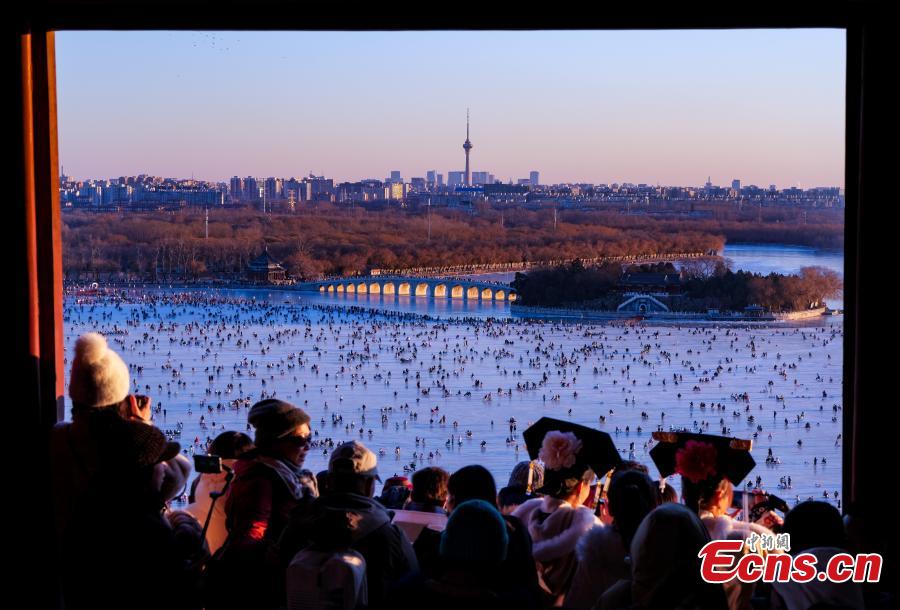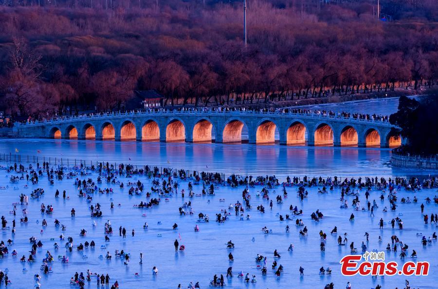 Tourists have fun on Kunming Lake, Beijing's largest natural ice rink, with bright sunlight passing through the arches of the 17-Arch Bridge at the Summer Palace in Beijing, capital of China, Jan. 14, 2024. (Photo: China News Service/Zhang Wei)